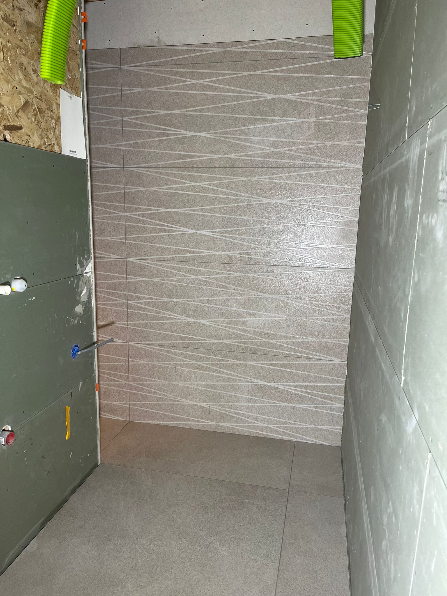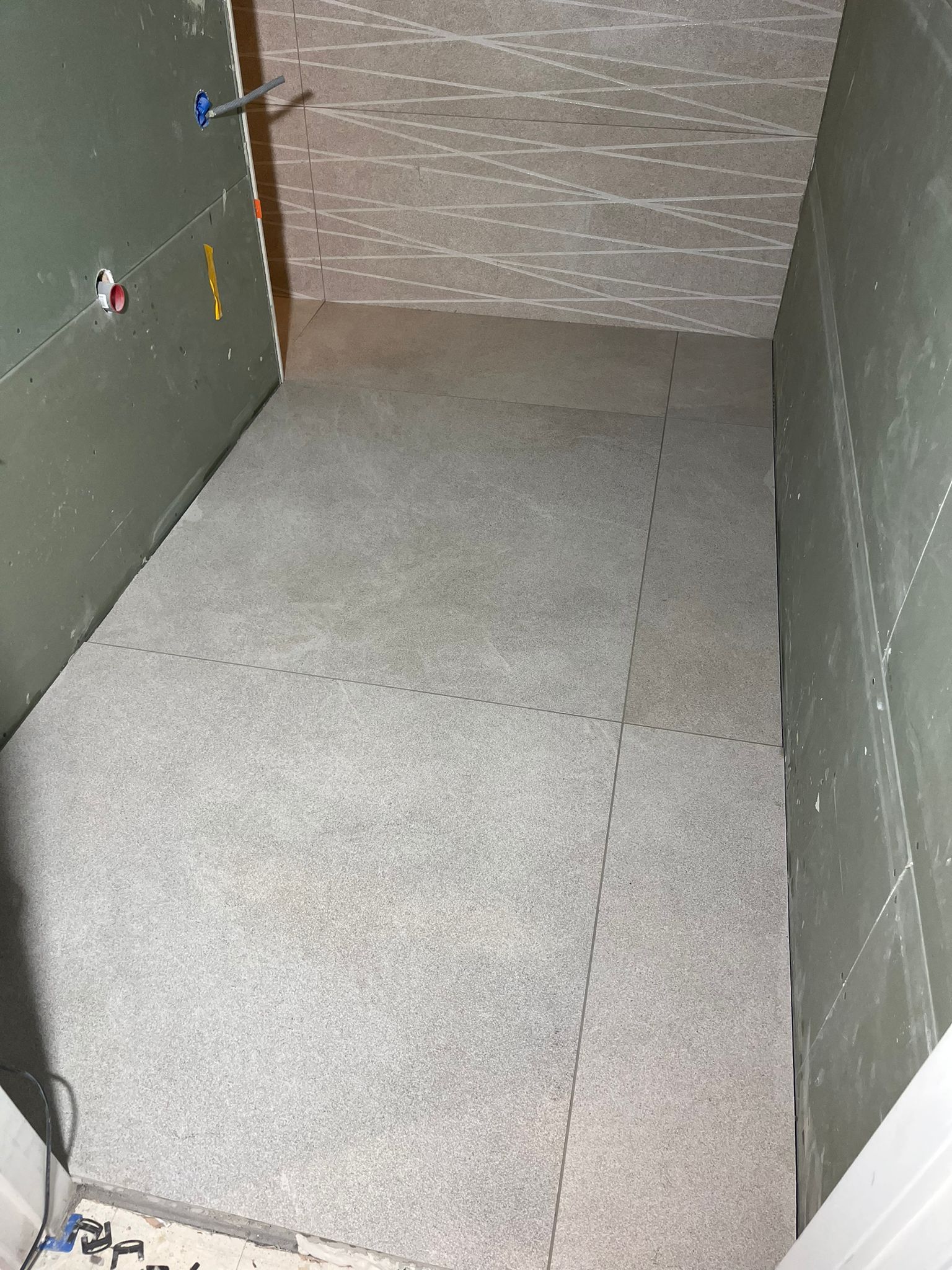 Badkamer in verstek met mooie 120x120 tegels gezet