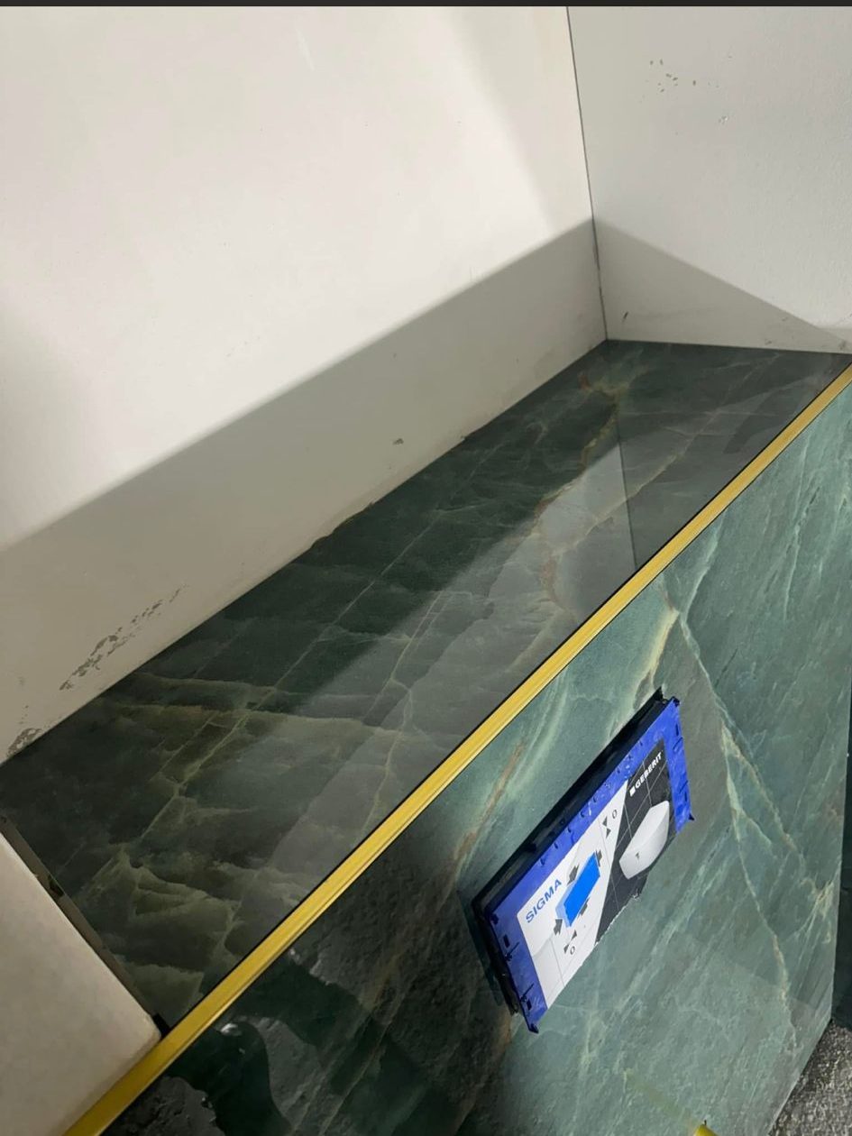 Het toilet volledig vernieuwd met nieuwe wandtegels, strak en hygiënisch afgewerkt. Alle randen en overgangen zijn afgewerkt met een messing tegelprofiel, wat zorgt voor een luxe en hoogwaardige uitstraling. Het resultaat is een duurzaam, stijlvol toilet met een luxe uitstraling.