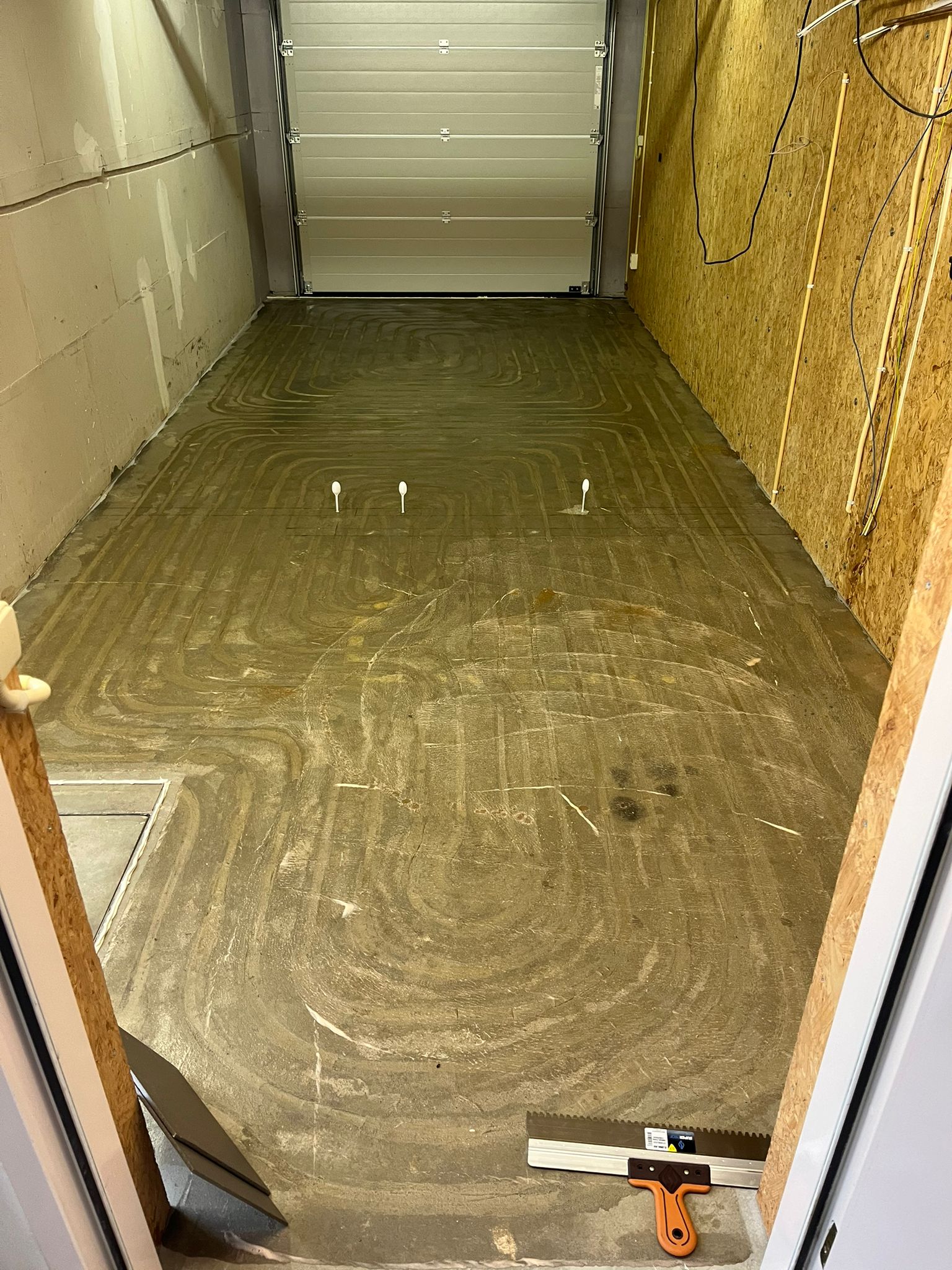Een vloer leggen met ingebouwde vloer verwarming, vervolgens complete vloer egaliseren.